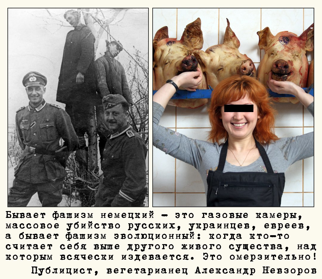 Фашисты так и говорили: Русские — это не народ в общепринятом смысле слова, а сброд, обнаруживающий ярко выраженные животные черты. Это можно с полным основанием отнести как к гражданскому населению, так и к армии (говорил в 1942 году). Пауль Йозеф Геббельс «Они бесчувственны, словно животные. Лишения и нищета — обычные условия их существования, и потому русские не так уж сильно цепляются за жизнь.», - А. Гитлер «Те, с кем мы здесь сражаемся — не люди, а животные». Вильгельм Прюллер То были фашисты немецкие. А есть фашисты "эволюционные":
