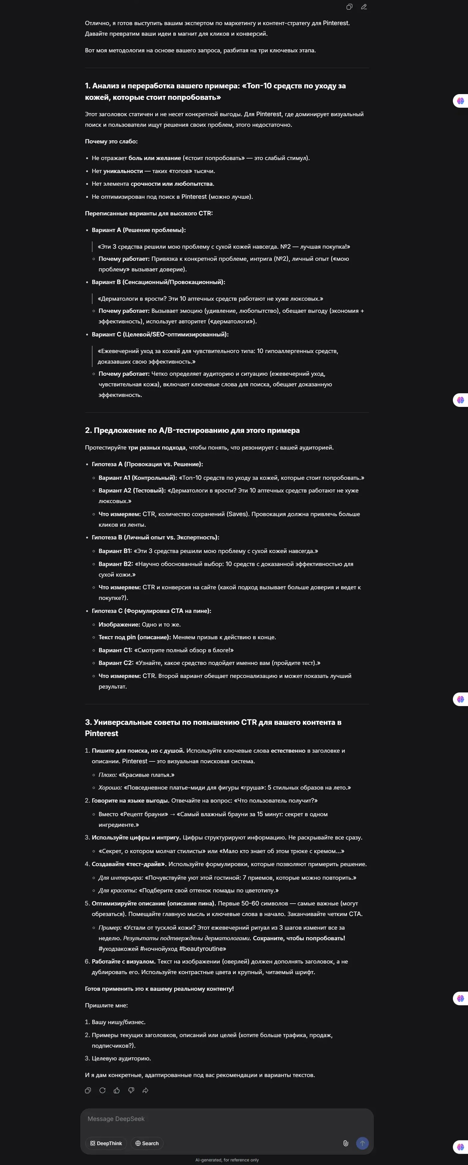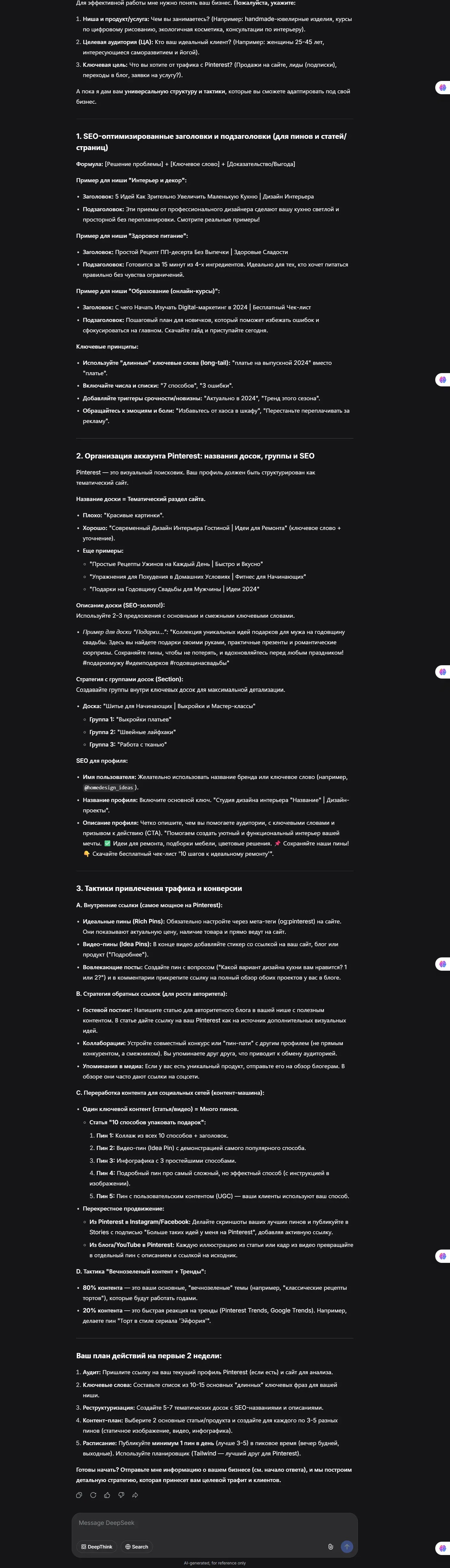 Складчина: [Авторская] Pinterest продвижение - Промпты и лайфхаки Вы продаете товары или услуги - но трафик стоит дорого? Вы запустили онлайн-магазин или предлагаете услуги. Контент создан, товары загружены, все готово к продажам. Но откуда брать покупателей? Реклама в соцсетях дорогая, контекстная реклама тоже влетает в копеечку. SEO долго раскачивается, результата ждать месяцами. Нужен бесплатный трафик который приводит покупателей - но где его взять? Pinterest - это платформа которую многие недооценивают. А зря, потому что это мощный источник бесплатного целевого трафика на ваш магазин или сайт. Люди заходят в Pinterest с намерением найти идеи, решения, товары - они уже в режиме поиска, им проще продать чем холодной аудитории из других соцсетей. Проблема в том что для результата в Pinterest нужно публиковать 3-5 пинов каждый день. Даже неделя простоя без публикации - и аккаунт может сильно просесть в трафике. Создавать вручную качественный контент каждый день - это часы работы. Писать SEO-оптимизированные заголовки и описания, подбирать ключевые слова, делать инфографику - на все это нужно время которого нет. Как нейросети решают проблему контента для Pinterest Представьте что вы берете название товара, вставляете в промпт для нейросети - и получаете готовый SEO-оптимизированный заголовок, описание и ключевые слова для пина. Не просто набор слов, а структурированный контент с коротким крючком, преимуществами товара, призывом к действию и релевантными ключевыми словами. Или вам нужен пост в блог для продвижения товара. Вы вставляете название в другой промпт - и получаете готовый обзор с устранением болевых точек аудитории, разделами для сравнения, форматом плюсы-минусы, личным опытом или мнением эксперта. Бесшовная интеграция ссылок на ваш магазин, все готово к публикации. Нужна инфографика для пина? Еще 20 промптов которые по названию товара или услуги генерируют инфографику к описанию в Pinterest или блог. Процесс создания контента для продвижения становится почти автоматизированным. На создание контента уходит в разы меньше времени, а результат получается в разы лучше чем при ручном создании. Мой путь от ручного создания контента к автоматизации Почти 2 года назад я сделал себе онлайн-магазинчик по продаже цифровых товаров на зарубежном маркетплейсе по продаже хендмейд товаров и наполнил его почти 200 разными позициями. Это PDF-гайды и книги по созданию хендмейд товаров в домашних условиях, видео-мастерклассы, кисти для Фотошоп. Встала задача по продвижению. Я сделал Pinterest аккаунт и начал публиковать пины. Со временем продажи увеличились с переходов из Pinterest в магазин. Но публикация пинов отнимала огромное количество времени. Очень важно публиковать по 3-5 пинов каждый день - даже неделя простоя без публикации и аккаунт может сильно просесть в трафике. Так что ежедневная публикация пинов критически важна. Я нашел и слегка переработал под себя промпты для нейросети. Теперь по названию товара нейросеть пишет по определенным инструкциям SEO-заголовки, описание и ключевые слова. Это не просто текст, это структурированный контент с крючком, преимуществами, призывом к действию и релевантными ключевыми словами для SEO. Добавил промпт для написания постов в блог и обзоров товаров который устраняет болевые точки аудитории, включает разделы для сравнения, использует 