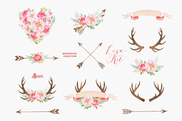 [Creativemarket] 2 в 1 Love Whispers & Love Kit. Watercolor collection. Акварель цветы, рога, стрелы