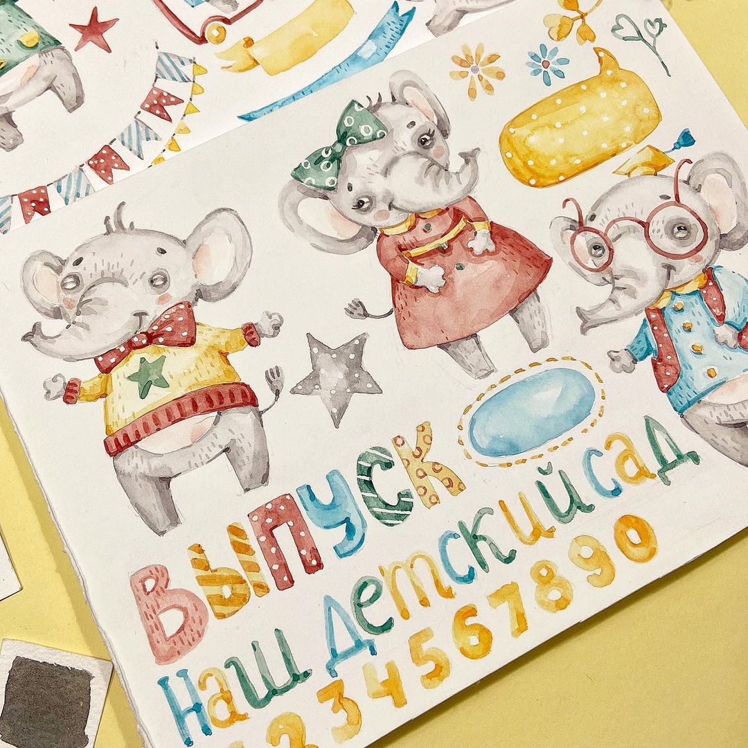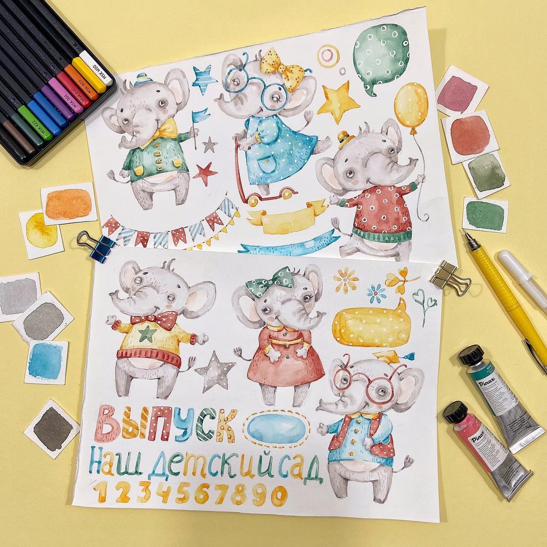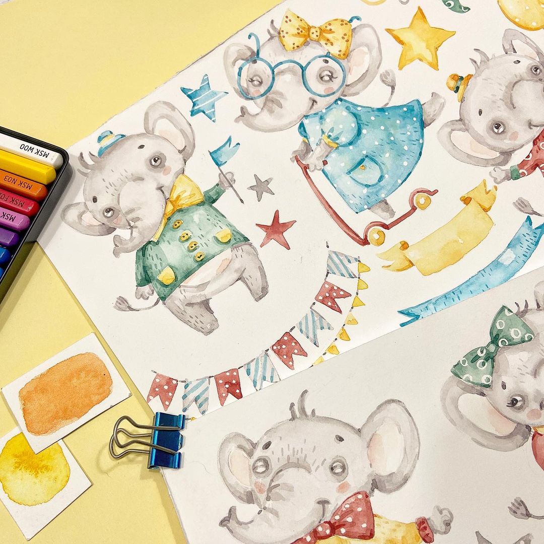 [Графика] Набор акварелек «Слоники» [Ксения Фёдорова]