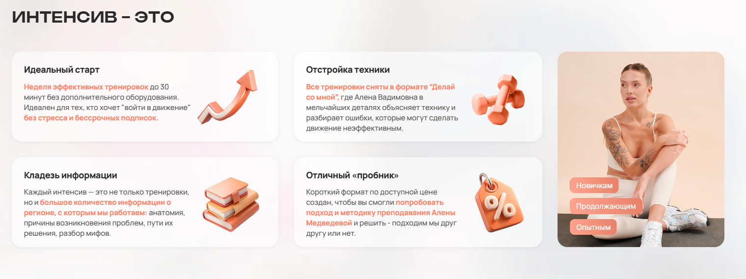 Похожие складчины Доступно - Интенсив "Проблемные зоны" [Алена Медведева] Открыто - Сливайся. Интенсив против отеков [Алена Медведева] [Повтор] Доступно - Интенсив Красивая осанка (2024) [Алена Медведева] Открыто - Мышцы тазового дна. Интенсив [Алена Медведева] Открыто - Ягодицы и таз. Интенсив [Алена Медведева]