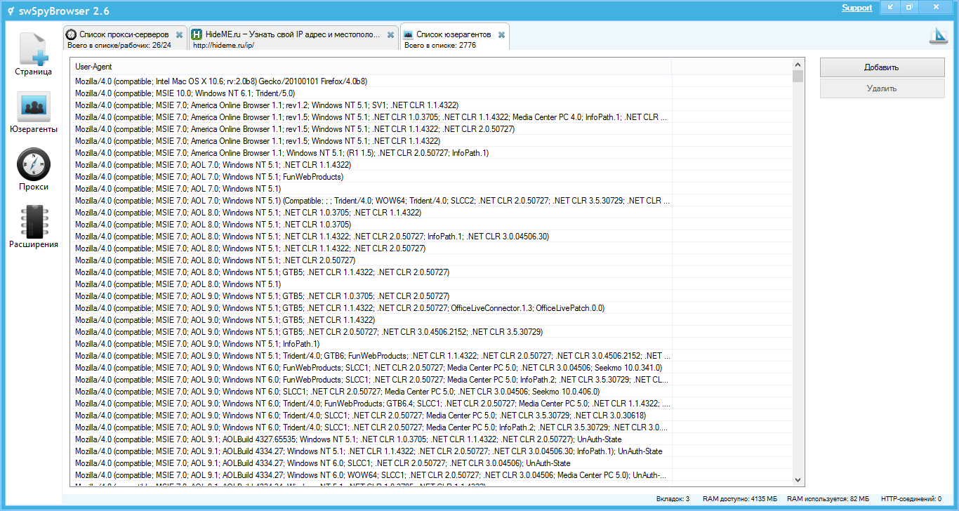 • Каждая вкладка swSpyBrowser имеет свой useragent, это позволяет обойти некоторые фильтры социальных сетей