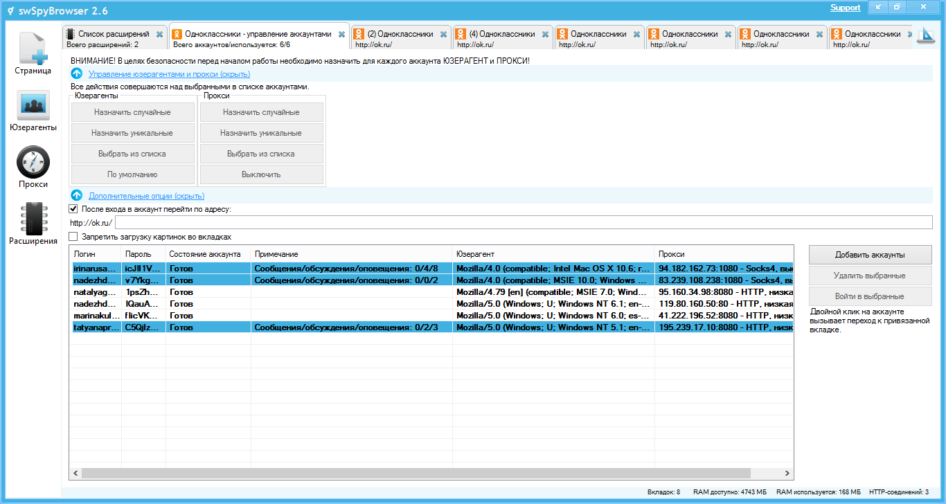 • Каждой вкладке swSpyBrowser назначается свой прокси-сервер, каждая вкладка/аккаунт имеет свой IP-адрес.