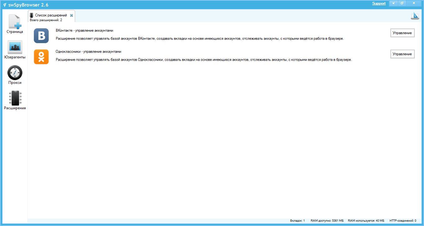 В комплекте с программой swSpyBrowser поставляются расширения для управления аккаунтами в социальных сетях ВКонтакте, Одноклассники и Facebook.