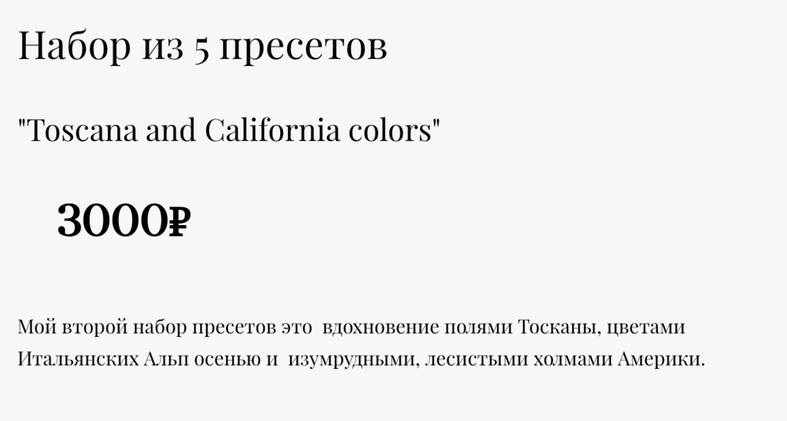 [Пресеты] Набор из 5 пресетов: Toscana and California colors [Юлия Трегубова]