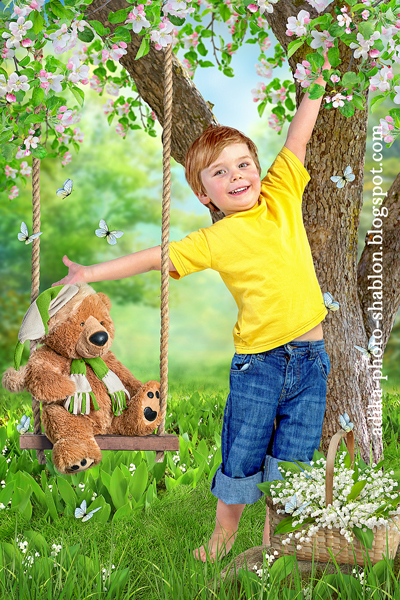 [PSD] Детский весенний фотошаблон Мишка на качелях [adika]
