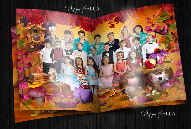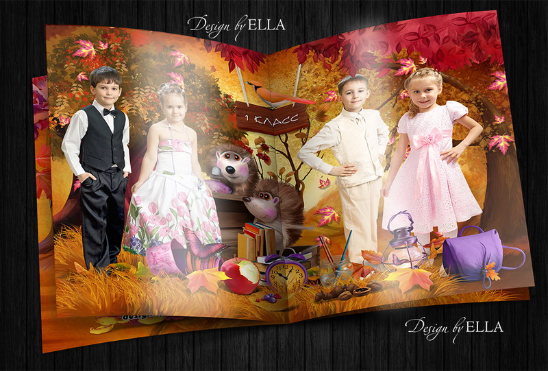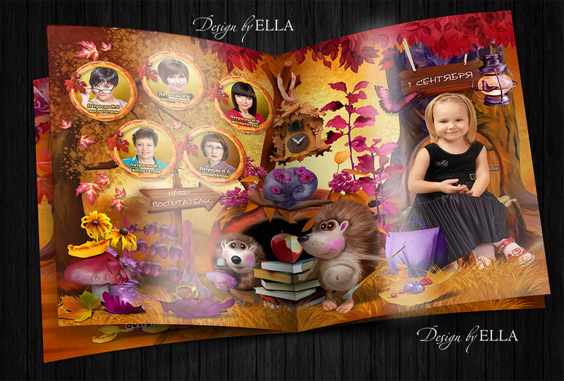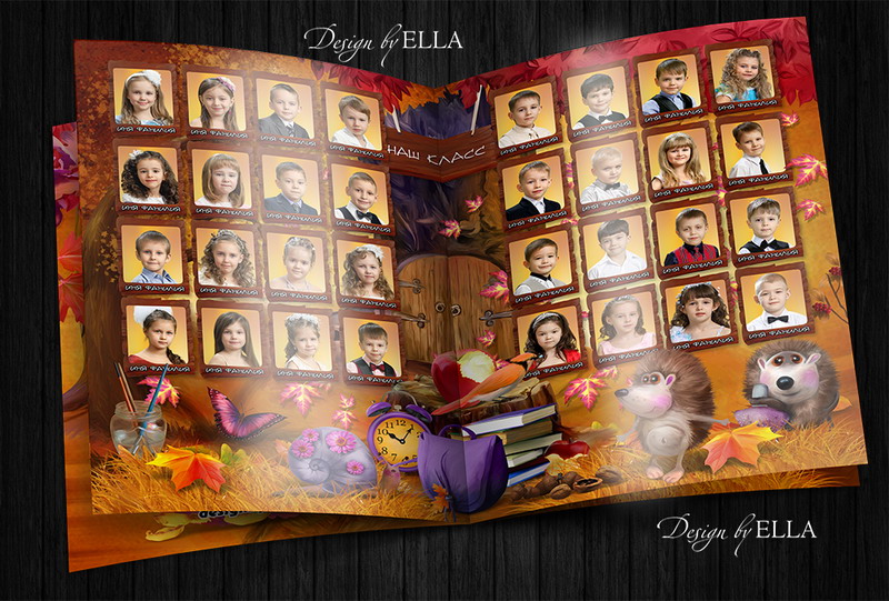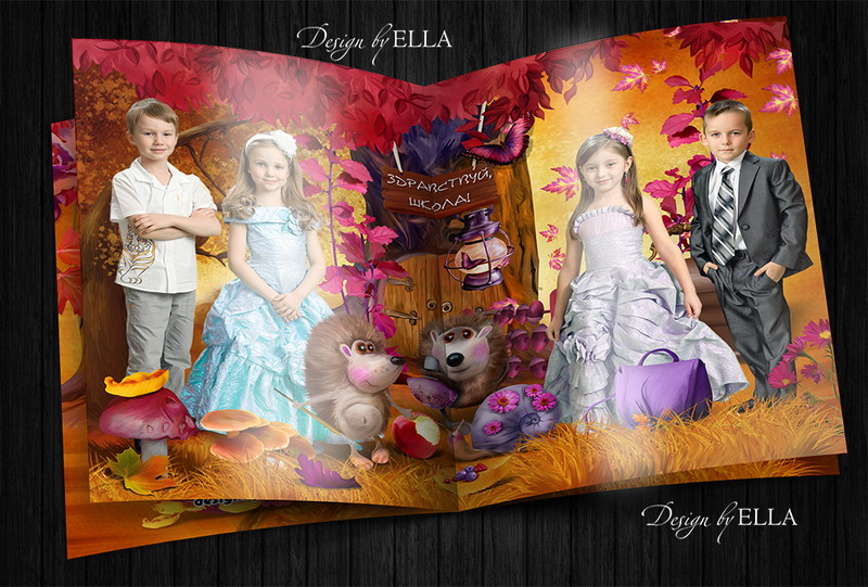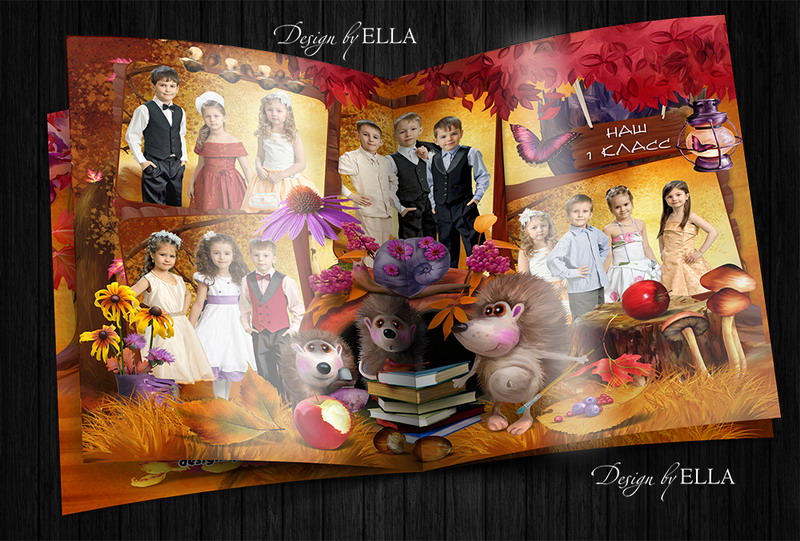 [PSD] Фотокнига «Ёжикина школа» детсад, 1-4 кл (выпускной альбом, виньетка)