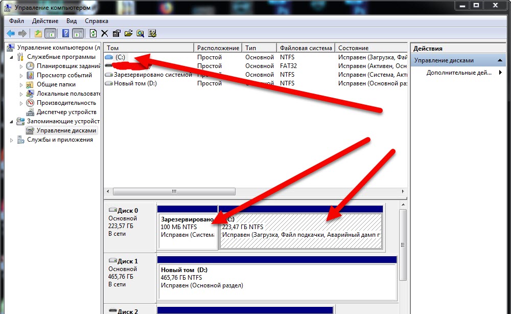 Нажми правой кнопкой на Мой компьютер и там открой Управление Открой раздел Управление дисками И там увидишь свой диск С Как видишь у меня на скрине показывает что там 2 раздела 1) 100 мб 2) 223,47 ГБ Если у тебя там лишний раздел что сразу увидишь