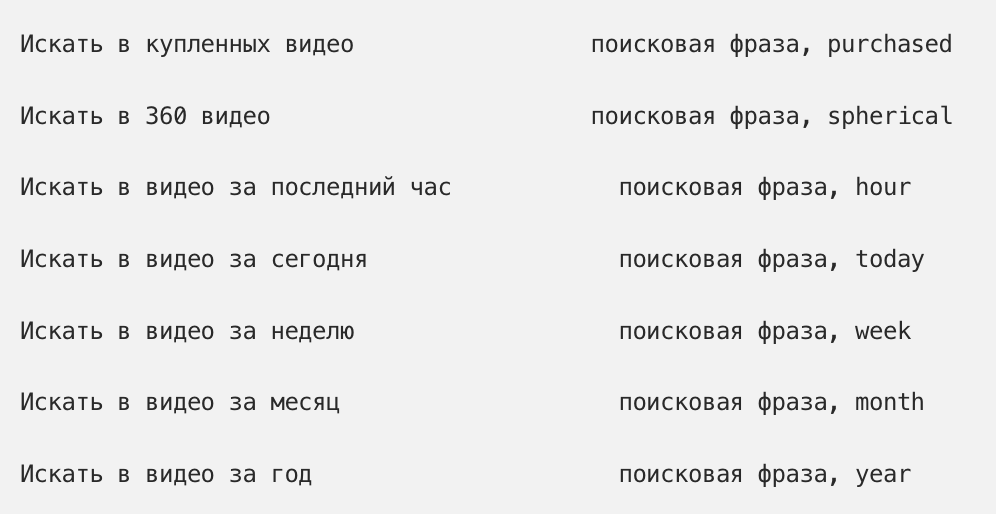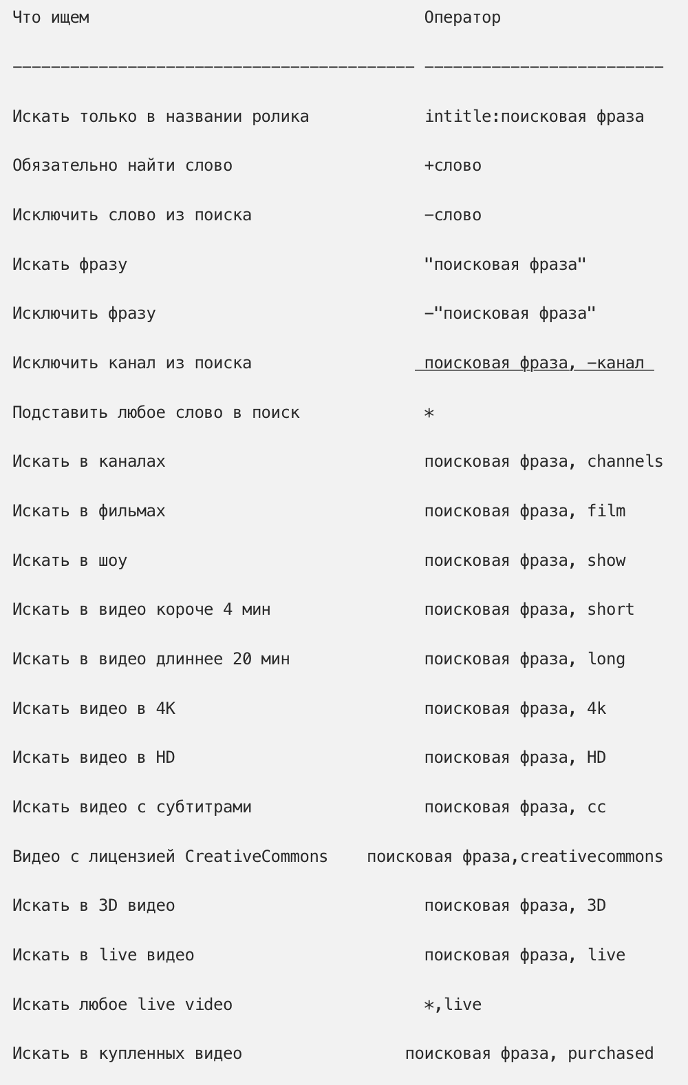 В YouTube нет таких крутых операторов как в поисковых движках Yandex/Google. Зато есть свои, и они частенько могут упростить поиск нужных вещей.
