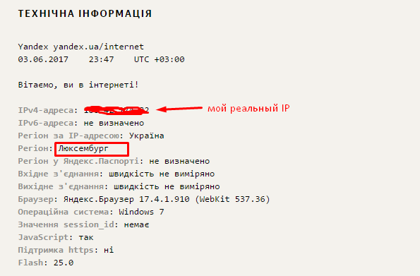 Нет, мне просто аккаунт в фб забанили ил-за частой смены айпи, в мерах безопасности. Яндекс браузер подменяет айпи, уже спросил у друзей и у всех айпи европейские. Смотри скриншот с яндекса и поймешь, оказывается в Украине есть регион Люксенбург