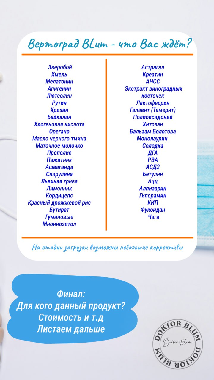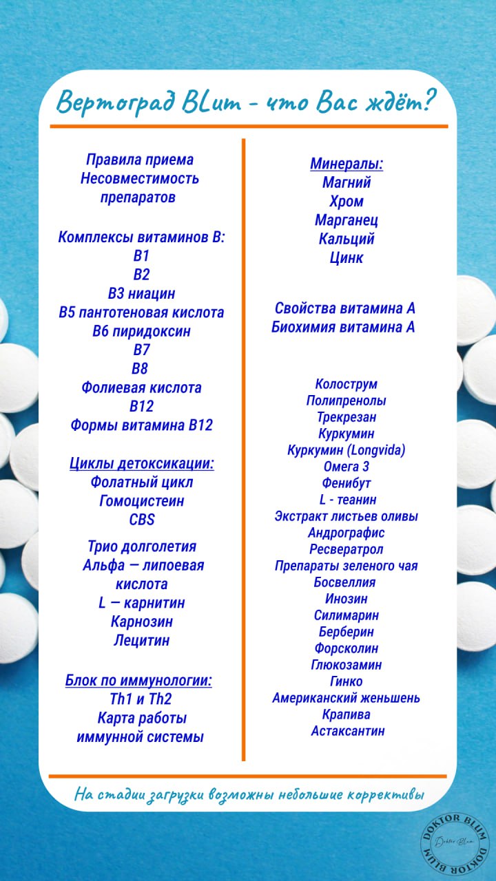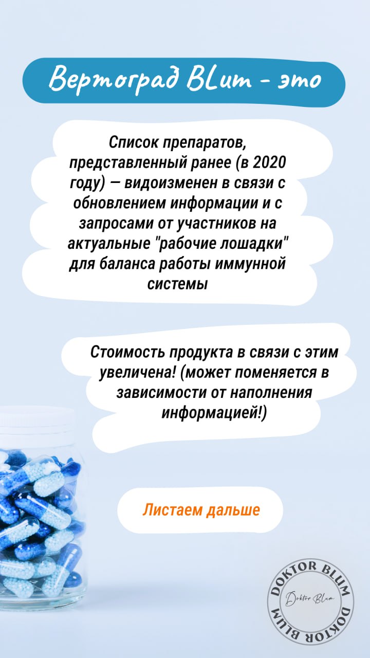 Складчина: Вертоград Blum. Группа о препаратах и немного больше [Юлия Блюм] Это не просто общая информация о препаратах, а объяснения сути работы основных циклов, участвующих в детоксикации, полный блок иммунологии: Большая ментальная карта с навигацией по препаратам и разъяснениями принципов работы иммунной системы! Список препаратов, представленный ранее (в 2020 году) — видоизменен в связи с обновлением информации и с запросами от участников на актуальные "рабочие лошадки" для баланса работы иммунной системы Стоимость продукта в связи с этим увеличена! (может поменяется в зависимости от наполнения информацией!) Так как Мы полностью меняем формат в " "Вертограде", та информация, которая была и присутствует на проекте будет обновлена после окончания продаж, а именно 31.10.2024 года! Автор: Доктор Юлия Васильевна Блюм Стоимость: 7500 руб. (до 31.10.2024) Скрытая ссылка