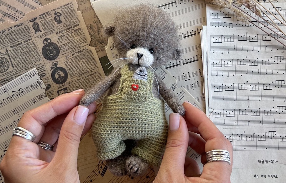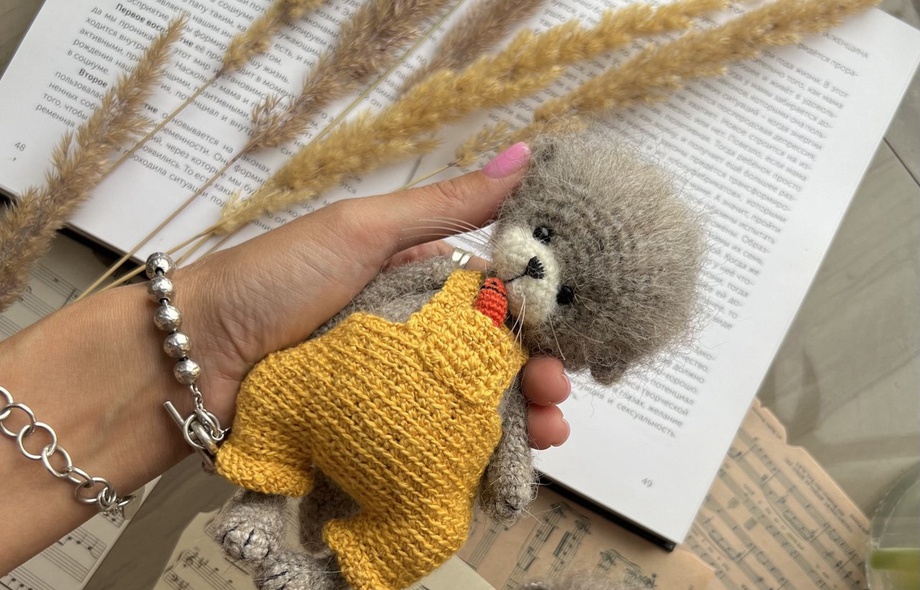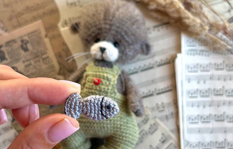 [Вязаные игрушки] Выдренок в комбинезончике с рыбкой [Анастасия Пономарева]