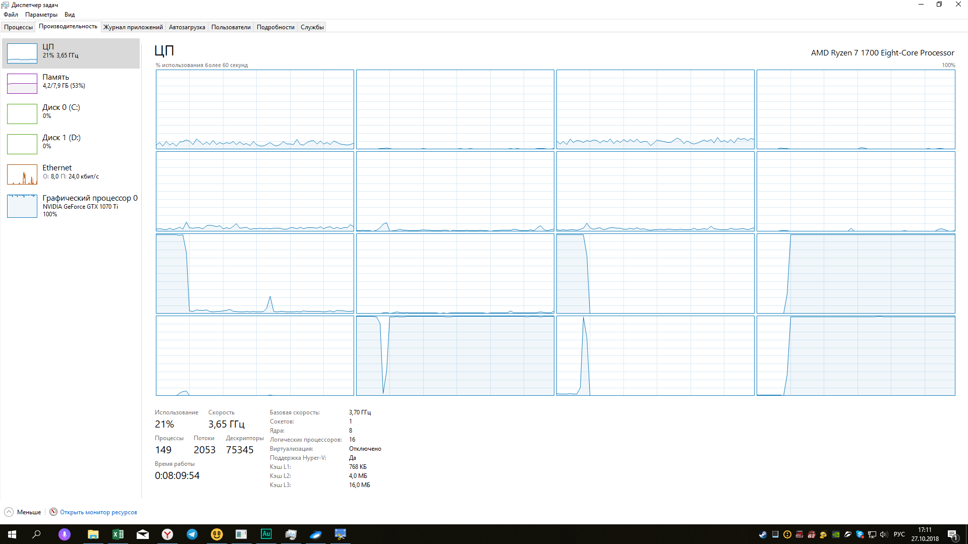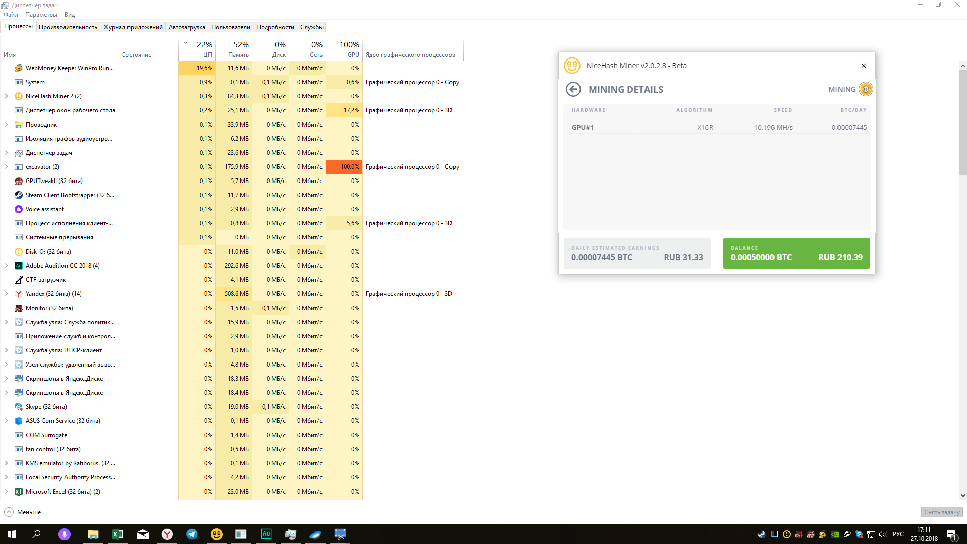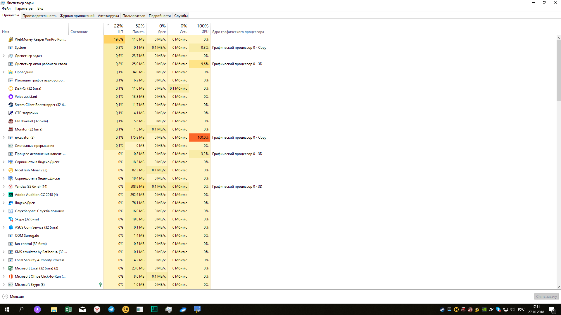 Привет! Уже не первый раз замечаю вот такую картину в диспетчере задач: Да, вы можете заметить, что там открыт Экскаватор (майнер НайсХеш)... Но в нём включен майнинг только видеокартой... --- Собственно много раз ловил клиент Вебмани на такой вот загрузке процессора. Лечится это только перезапуском клиента... "Активируется" при долгих простоях компьютера... Относил это к внутренним нуждам софта, может к глюкам или сбоям... Вчера винду переустановил, запустил днём майнинг на ВК, на ЦП повешал рендеринг 3 часов аудио и ушёл. Прихожу - клиент ВМ опять загружает на 100% 2 ядра/4потока ЦП... (Ryzen 1700) Ваши предположения дамы и господа? Это скрытый майнинг? Или у меня просто сезонное обострение? PS На последнем скриншоте, нагрузка на 1 из потоков обрывается Если наблюдать за этим графиком, она через пару секунд снова появляется... Очень похоже на майнинг Монеро на Экскаваторе (там тоже майнинг идёт пару минут, сброс и снова начинается.. или блок находит или ещё что-то происходит...)